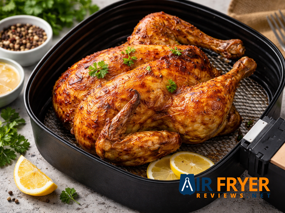 Wider interiors make it easier to roast whole chicken in air fryer without the thighs crowding the walls. Many models include rotisserie that constant rotation can eliminate mid-cook flipping and produce exceptionally even color on a roasted chicken in air fryer.